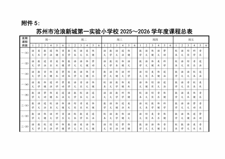 苏州市沧浪新城第一实验小学校2025~2026学年度课程表